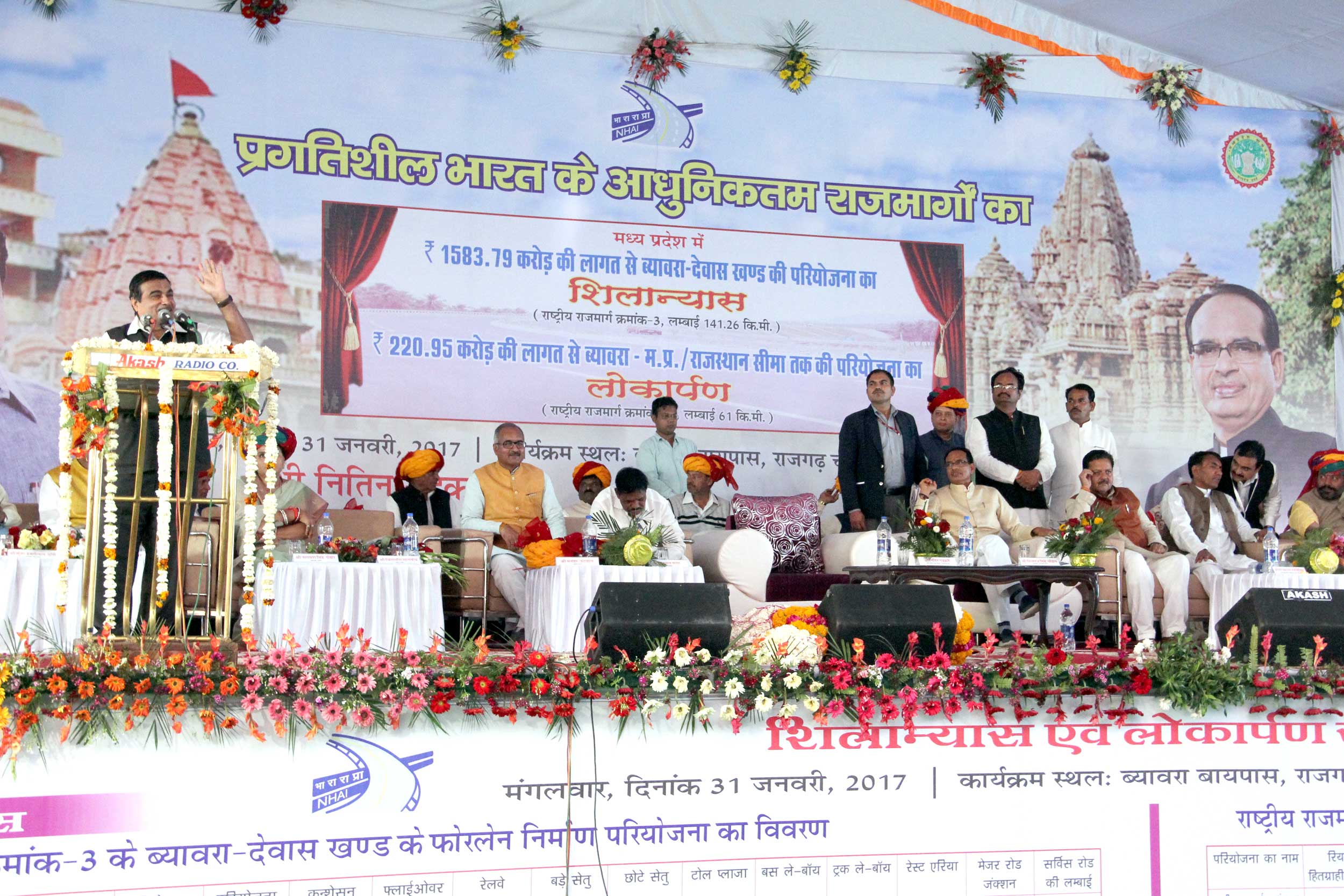 गडक़री राजगढ़ जिले के ब्यावरा में राजस्थान सीमा तक 220.95 करोड़ लागत के 61 किलोमीटर लम्बे टू-लेन सडक़ मार्ग विथ पेब्ड सोल्डर का लोकार्पण कर रहे थे. उन्होंने ब्यावरा-देवास फोर-लेन मार्ग का भी शिलान्यास किया. इस मार्ग की लम्बाई 141.26 किलोमीटर है और लागत 1583.79 करोड़ रुपये है.