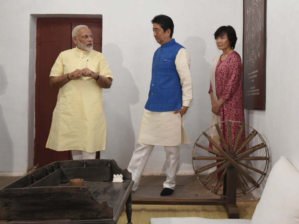 अहमदाबाद हवाई अड्डे से आठ किलोमीटर लंबे रूट पर लोगों का अभिवादन करते हुए प्रधानमंत्री नरेन्द्र मोदी जापानी पीएम शिंजो आबे के साथ साबरमती आश्रम पहुंचे| साबरमती आश्रम में पीएम मोदी और आबे ने हृदयकुंज में गांधीजी को सूताजंलि अर्पण की| बाद में मोदी आबे दंपत्ति को वहां ले गए गांधीजी जहां चरखा चलाते थे, जहां चरखा और खादी के बारे में जापानी पीएम को जानकारी दी| मोदी ने आबे दंपत्ति के साथ साबरमती आश्रम के पीछे बने रिवरफ्रंट पर कुछ समय बिताया| साबरमती आश्रम की विजिटर बुक में जापान के पीएम ने अपनी मातृभाषा में संक्षिप्त संदेश लिखा| जिसका मतलब “शिन्जो आबे की ओर से प्रेम और शांति का संदेश|” साबरमती आश्रम से आबे दपंत्ति शहर की होटल हयात के लिए रवाना हो गए|