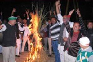 गुस्साए किसानों ने UP विधानसभा के बाहर जलाया गन्ना