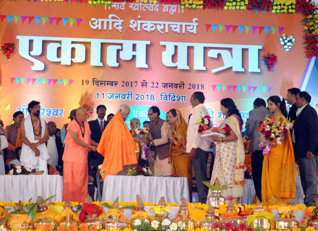 भोपाल,आदि गुरु शंकराचार्य एकात्म यात्रा ने आज विदिशा, भोपाल, मंदसौर, नीमच, ग्वालियर और नरसिंहपुर जिलों में 431 किलोमीटर की दूरी तय करने के साथ 686 धातु पात्रों का संकलन किया। मुख्यमंत्री शिवराज सिंह चौहान धर्मपत्नी श्रीमती साधना सिंह चौहान के साथ विदिशा के जन-संवाद में शामिल हुए। आज हुई यात्रा और जन-संवादों में एक लाख 750 लोगों ने भाग लिया।