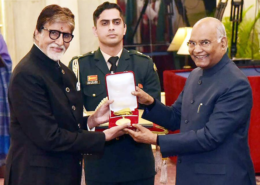 नई दिल्ली, राष्ट्रपति रामनाथ कोविंद ने सदी के महानायक अमिताभ बच्चन को दादा साहब फाल्के पुरस्कार से सम्मानित किया है। इस खास मौके पर उनके साथ पत्नी जया बच्चन और बेटे अभिषेक बच्चन साथ नजर आए। इस मौके पर उन्होंने कहा- ”मैं भारत सरकार और सूचना प्रसारण मंत्रालय और ज्यूरी के सदस्यों को अपनी तरफ से आभार प्रकट करना चाहता हूं कि उन्होंने मुझे इस योग्य समझा। ईश्वर की कृपा रही है। माता-पिता का आशीर्वाद रहा है। सबसे ज्यादा भारत की जनता का स्नेह रहा है जिसकी वजह से मैं आपके सामने खड़ा हूं। जब इस पुरस्कार की घोषणा हुई तो मेरे मन में ये सवाल उठा कि क्या ये मेरे लिए संकेत है कि बस अब हो गया, या मुझे अभी और काम करना है। 23 दिसंबर को 66वें राष्ट्रीय फिल्म पुरस्कारों के आयोजन के समय अमिताभ बच्चन उपस्थित नहीं हो पाए थे। बीमार होने की वजह से अमिताभ बच्चन को डॉक्टर द्वारा सफर ना करने की हिदायत दी गई थी। अमिताभ बच्चन ने 22 दिसंबर की शाम को एक ट्वीट के माध्यम से खुद यह जानकारी शेयर की थी।अमिताभ बच्चन बॉलीवुड में ‘मेगा स्टार’ और ‘बिग बी’ के नाम से भी मशहूर हैं। गौरतलब है कि उनकी पहली फिल्म ‘7 हिंदुस्तानी’ थी, जो 1969 में रिलीज हुई थी। 1973 में प्रकाश मेहरा के निर्देशन में बनी फिल्म ‘जंजीर’ से अमिताभ बच्चन ने बॉक्स ऑफि़स पर कामयाबी की जो सीढ़ियां चढ़ना शुरू कीं तो फिर पीछे मुड़कर नहीं देखा। करीब दो दशक तक वे हिंदी फिल्मों के सबसे सफल नायक बने रहे। एक दौर ऐसा भी आया जब अमिताभ का फिल्मी करियर डावांडोल होने लगा था। इसके बाद अमिताभ ने फिर से नए सिरे से काम शुरू किया और नए निर्देशकों के साथ नए प्रयोग किए। उन्होंने ‘ब्लैक’ और ‘पा’ जैसे प्रयोगधर्मी फिल्में कीं। उन्होंने कौन बनेगा करोड़पति के जरिये टेलीविजन की दुनिया में कदम रखा और यहां भी इतिहास रच दिया। केबीसी को होस्ट करते हुए उन्हें लगभग दो दशक पूरे होने वाले हैं।अमिताभ को बॉलीवुड में 50 साल हो चुके हैं और इस दौरान उन्हें चार बार राष्ट्रीय फिल्म पुरस्कार, 15 फिल्मफेयर सहित कई पुरस्कार मिल चुके हैं। 2015 में उन्हें पद्म विभूषण से भी सम्मानित किया था।