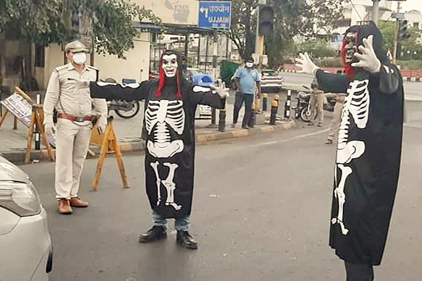 अब तो भैया घरो में रहो … इन्दौर पुलिस ने सड़क पर उतारे कोरोना भूत
