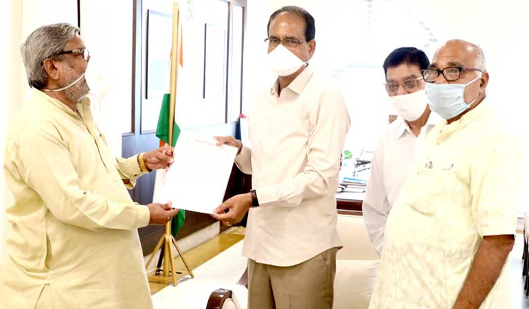 मुख्यमंत्री चौहान को लोकतंत्र सेनानी संघ ने कोविड सहायता के लिए पाँच लाख रूपए का चेक भेंट किया