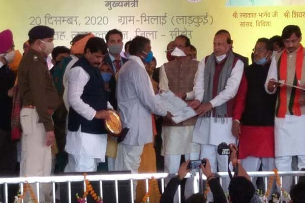 मुख्यमंत्री श्री चौहान आज सीहोर जिले की नसरूल्लागंज तहसील के ग्राम भिलाई में जनजातीय परिवारों को वनाधिकार पट्टों का वितरण कर रहे थे। कार्यक्रम में 1216 हितग्राहियों को वनाधिकार पट्टों का वितरण किया गया। इनमें इछावर, आष्टा, नसरूल्लागंज एवं बुधनी के वनवासियों को वनाधिकार पट्टे दिए गए। कार्यक्रम में पशुपालन मंत्री श्री प्रेम सिंह पटेल, सांसद श्री रमाकांत भार्गव, राज्यसभा सदस्य श्री सुमेर सिंह सोलंकी आदि उपस्थित थे।