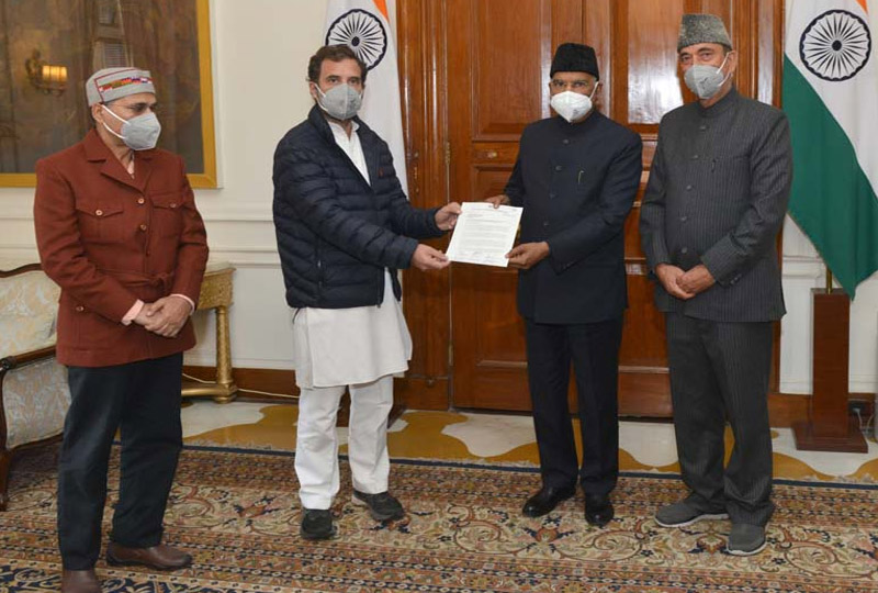 नई दिल्ली, तीन कृषि कानूनों के संबंध में पार्टी प्रतिनिधिमंडल की अगुवाई करते हुए राष्ट्रपति रामनाथ कोविंद से मुलाकात के बाद, राहुल ने कहा कि सरकार को संसद का संयुक्त सत्र बुलाकर इन कानूनों को वापस लेना चाहिए। प्रतिनिधिमंडल में राज्यसभा में नेता प्रतिपक्ष गुलाम नबी आजाद और लोकसभा में कांग्रेस के नेता अधीर रंजन चौधरी शामिल थे। उन्होंने दावा किया, प्रधानमंत्री का एक ही लक्ष्य है, कि दो-चार बड़े पूंजीपतियों के लिए पैसा बनाया जाए। जो भी प्रधानमंत्री के खिलाफ खड़ा होता है उस आतंकवादी बोल दिया जाता है। जो इनसे सत्ता लेने की कोशिश करेगा उस आतंकवादी और राष्ट्र विरोधी बोला जाएगा।’’